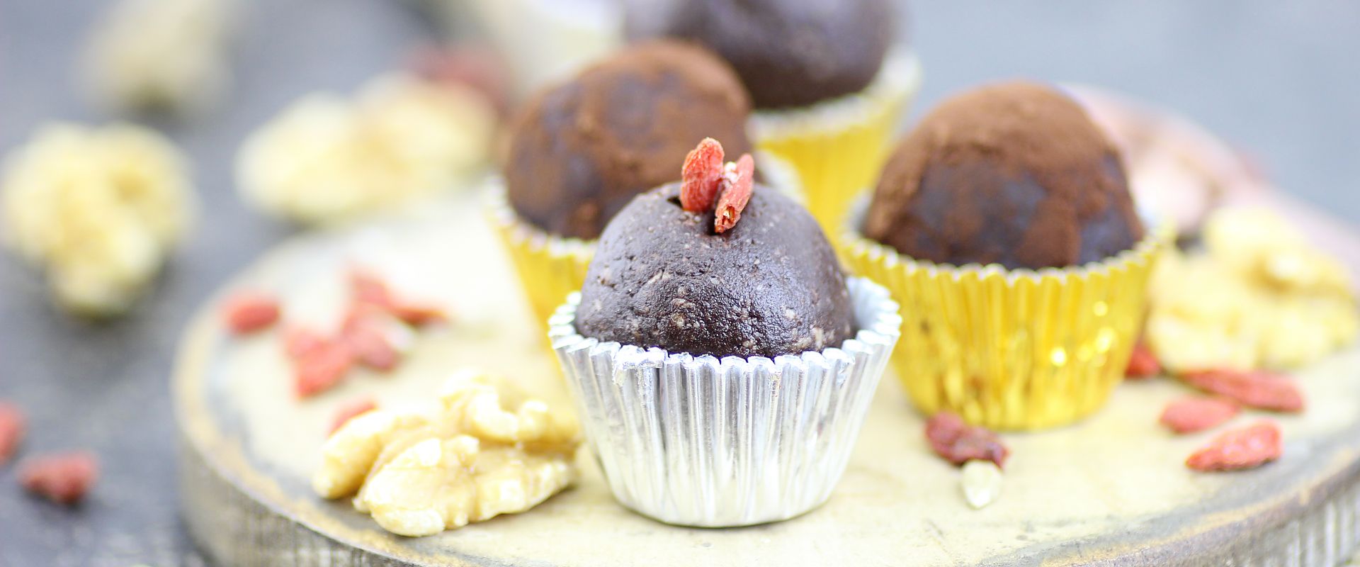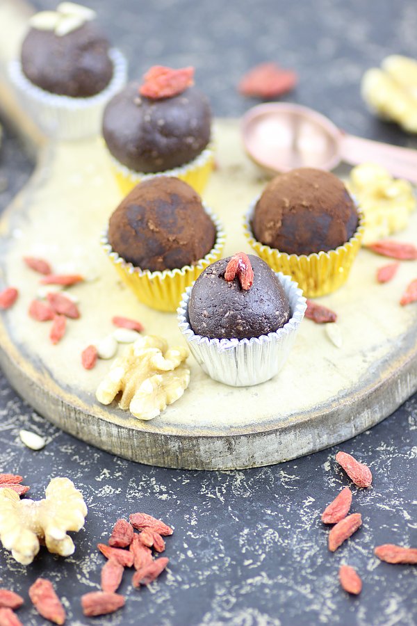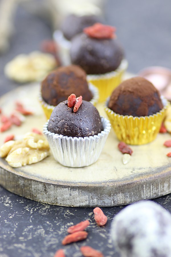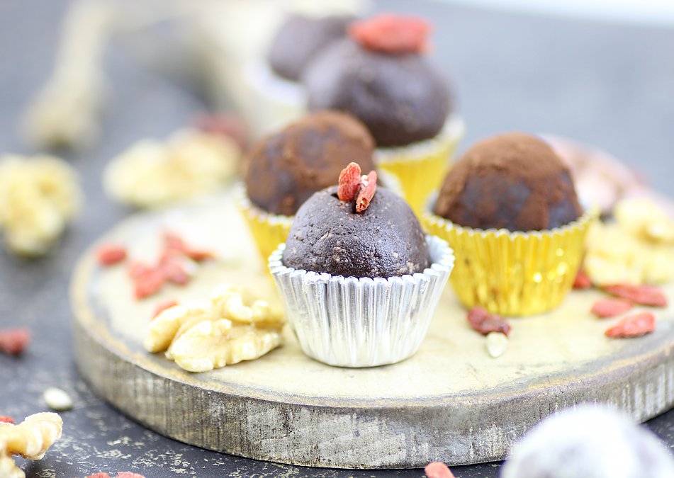 These simple little raw chocolate truffles taste just like the real thing. Dates, walnuts, cacao, seeds and salt combine in a food processor. Roll them in cacao or dried coconut for extra pizzazz. Garnish with goji berries for added color.