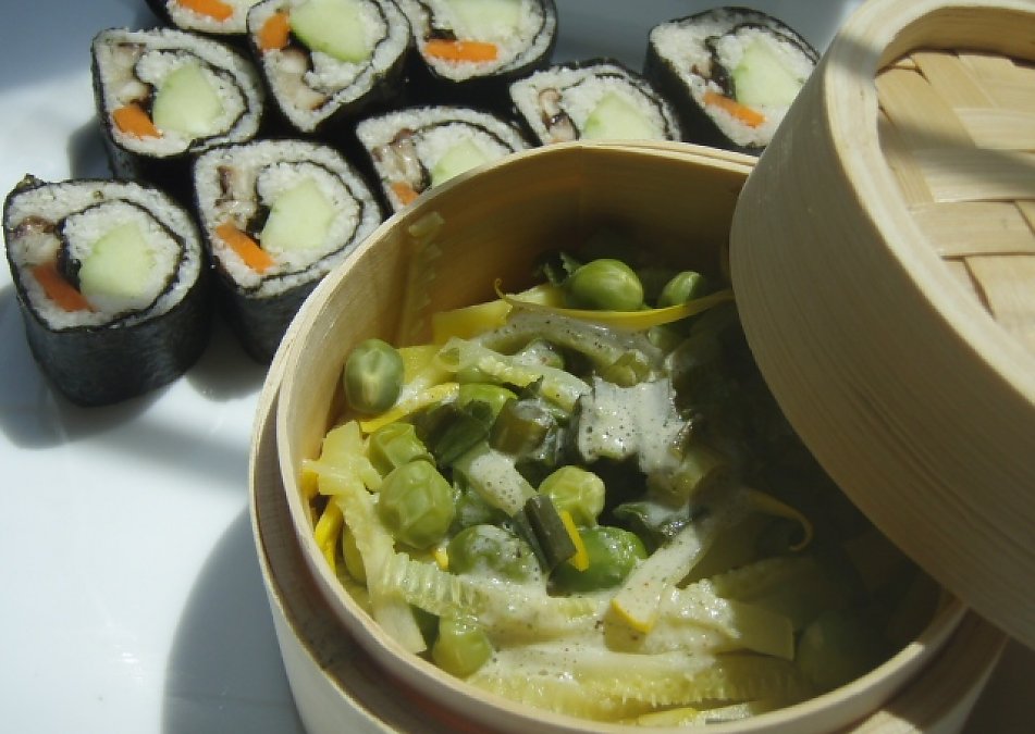 I love having sushi in the "raw". My favorite is futo maki and this is a rendition of the original futo maki that is made with pickled radish, egg or tamago, veggie and rice. At the same time, I wanted to use the fresh peas preshelled from the farmers market. I combined it with the golden zucchini then a touch of...