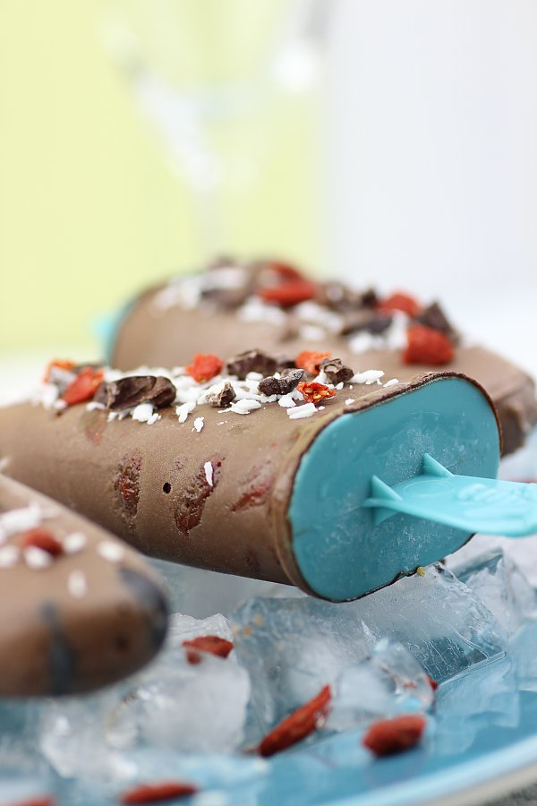 For optional extra fudgsicle fun, add cacao nibs, fresh berries, coconut, edible flowers, goji berries etc into the molds while pouring.