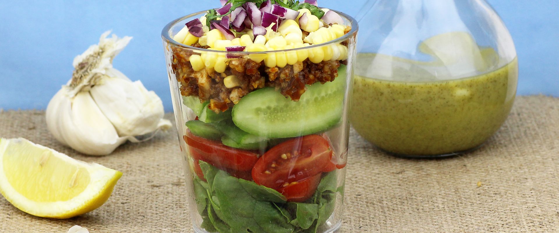 This taco salad is so satisfying. I love Mexican food. I make a huge salad with lettuce, spinach,tomatoes, cuke, onion,and then top it with some raw corn ,avocado, cilantro, and of course the taco "meat". Yum.