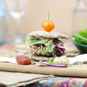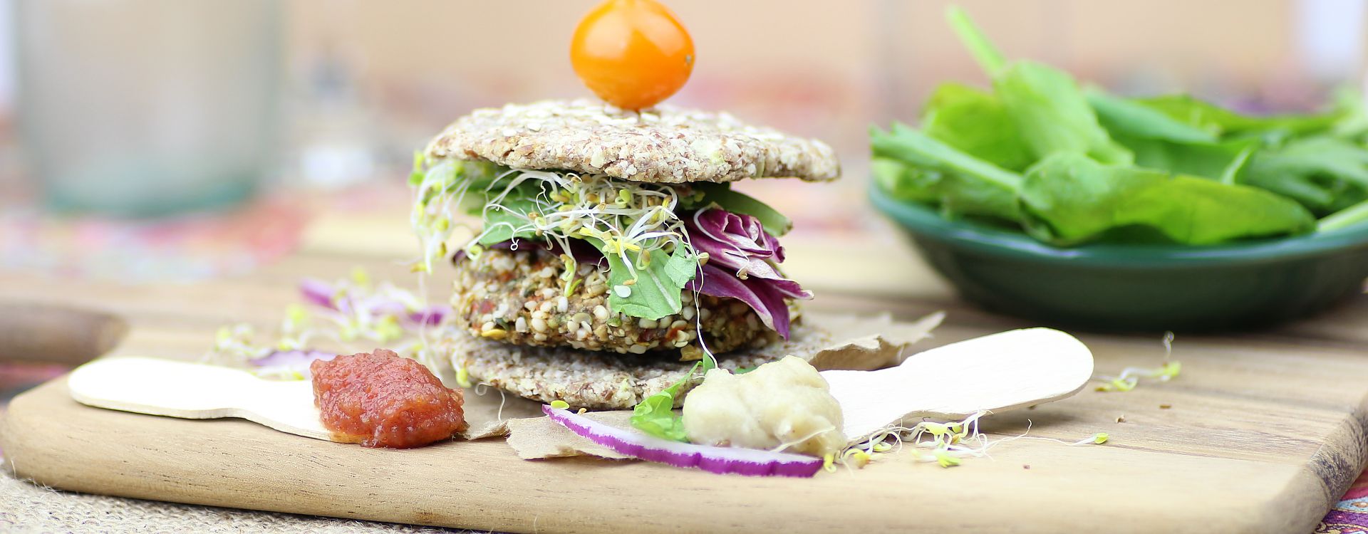 Raw veggie burgers! Use some crisp romaine lettuce as a "bun" and top with sliced tomatoes and cucumbers and a dollop of raw mayonnaise and you are set!