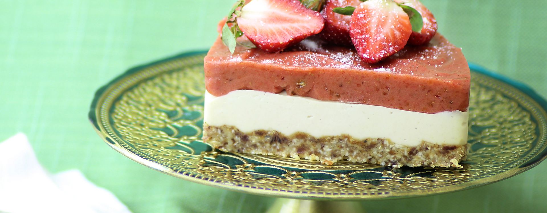 To make this cheesecake, process macadamia nuts, salt and dates in a food processor. Prepare your cheesecake pan by lining its bottom with dried coconut, and press down the crust mixture into it. For the filling, blend all the cheesecake filling ingredients in a high-speed blender, then pour the filling mixture on top of the crust mixture. Allow it to firm up for about an hour in the freezer while you make the final topping. Blend strawberries and dates to a nice and smooth consistency, and pour it over the raw cheesecake recipe. Let it freeze for a few more hours, and voila! You now have a pretty-licious raw cheesecake.