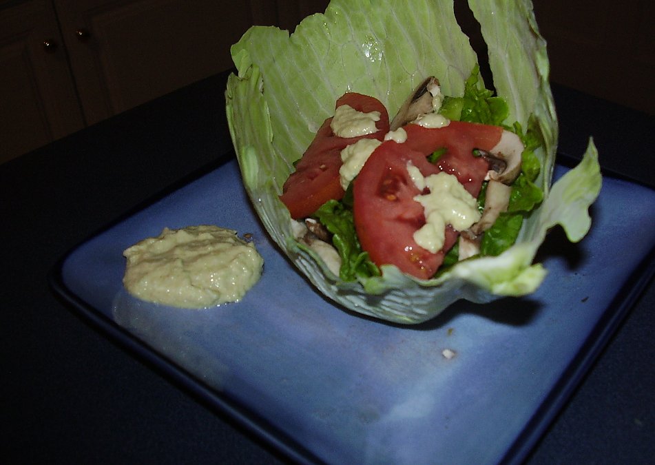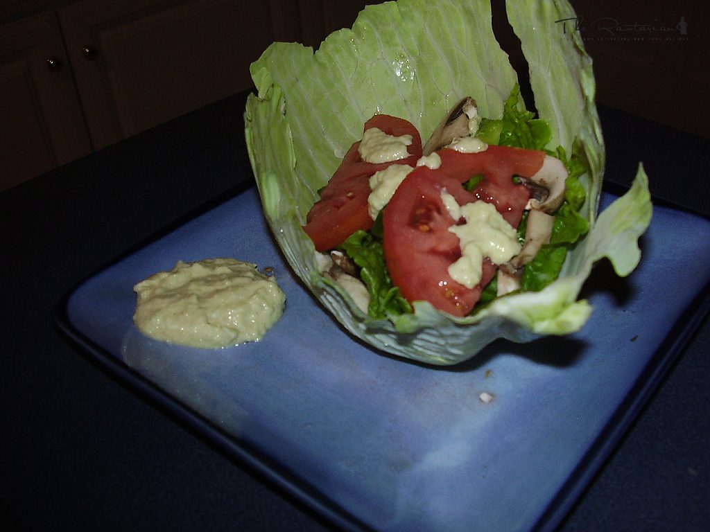 Spread cabbage leaf with hummus. Then pile on some greens, followed by the tomatoes, mushrooms, and peppers. Top it off with more hummus and a dash of cayenne pepper, and you’re good to go!