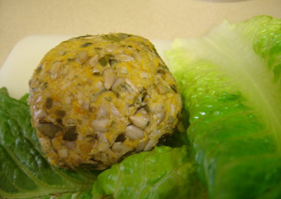 i created this recipe out of what was left over from the week prior to Grocery Day, and what generated was a really quick, simple, tasty appetizer that will fool even the most hard-core SAD omni! this cheeze ball is really a thick pate with a topping, that tastes like a cream cheeze in that it's sweet, is loaded...