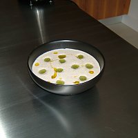 If you have a Vita-Mix, you are super lucky. I don´t, so this is what I did. Blend almonds and garlic until uniform. Add olive oil to blender and blend again. Add salt and water to the mix and blend yet again until a creamy soup forms. Serve garnished with grapes.