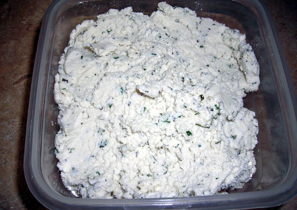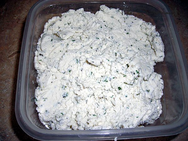 8. Place the cheese in a bowl and put in salt, a bit of olive oil maybe 2 tb or more and dried spices such as parsley, dill, tarragon, basil, etc.
