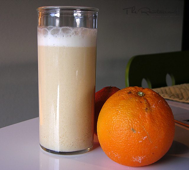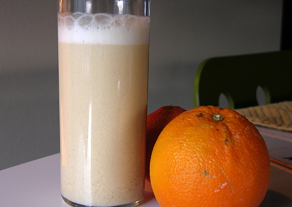 2. Measure 4 cups milk into blender and add 4 cups orange juice and one vanilla bean.