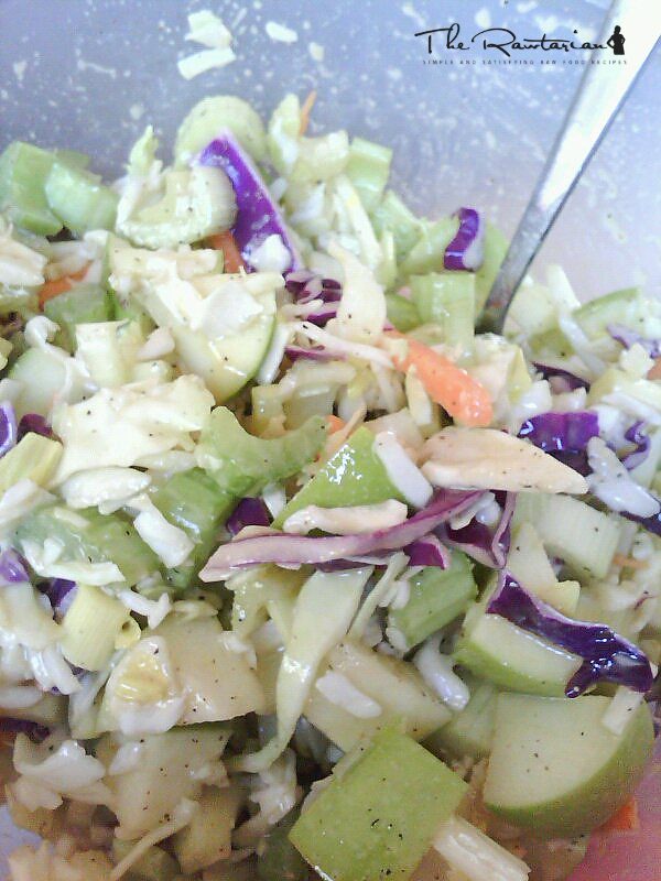 Drain celery; pat dry with paper towels. Combine celery, celery leaves, apples, cabbage and walnuts in large bowl. Add vinaigrette and toss to coat. Season salad to taste with salt and pepper.