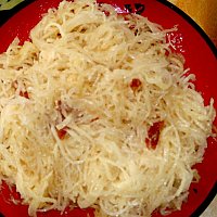 By Crisyn This recipe is an adaptation of several recipes – two by Chad Sarno, and one by Vanessa on GLiving. Chad Sarno calls it “Trio of Shaved Cabbages with Sweet Sesame Vinaigrette” – it really can be a simple salad or an elegant party dish. I just use what I have on hand, and the vinaigrette is never the same twice, but this always turns out so tasty. You can also add sliced baby bok choy, hemp seeds, etc. Hope you enjoy it!