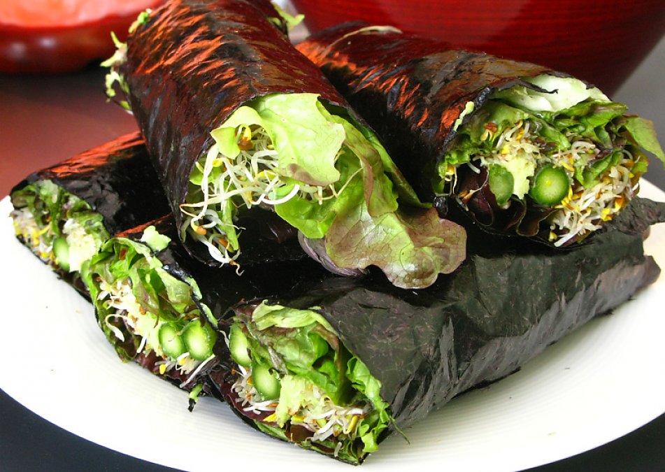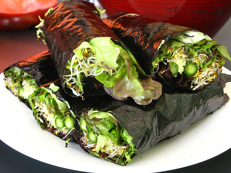 By kellymyra For an easy lunch option I keep a packet of nori sheets in the cupboard at work so I can stuff them with whatever greens and veges I bring with me or grab from the supermarket. Sprouts make a great stuffing for nori rolls as they are nice and compact allowing you to roll it up nicely. Almost any vegetable works in a nori roll, zucchini or cucumber, grated carrot, tomatoes, olives, herbs, the combinations are endless. Asparagus is right in season now and it’s the perfect shape for a nori roll.