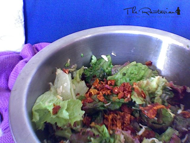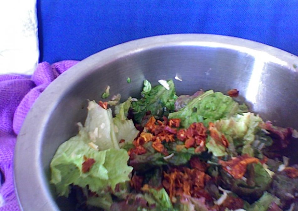 This salad tastes absolutely divine. Actually, it tastes like pizza. Feel free to vary the ingredients/amounts/dressing to accommodate your palette. To make dried tomato bits, simply slice thinly your favorite tomatoes and dry them for 24 hours on mesh sheets. Then break them into tiny bits the size of bacon bits....