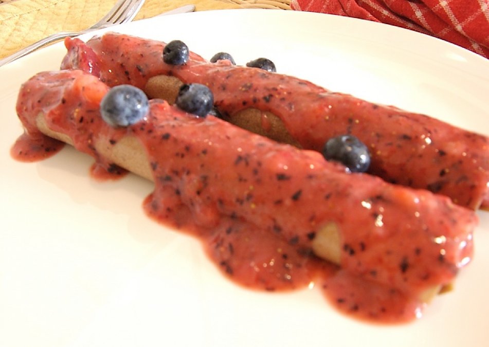 You may want to wait a few minutes before serving to allow the strawberry sauce to soften the banana crepes.