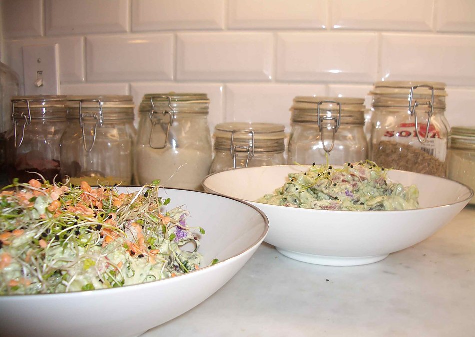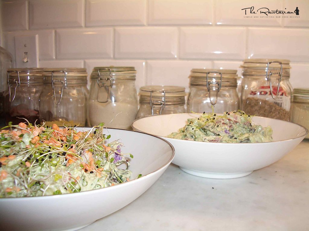 That's white zucchini pasta topped with onion sprouts and sprouted red lentils. There's some purple cauliflower and who knows what else in there!