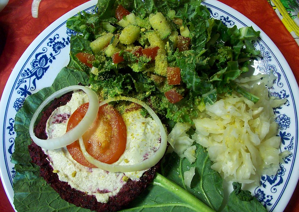 I had mine on a collard leaf with seed cheese, tomato, sauerkraut, and onion. I picked the whole thing up and folded it like a taco. Yum yum yum.