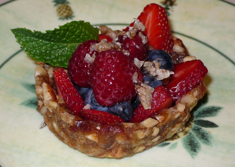 This looks sooo yummy!, easy and elegant. An alternative method for forming the tarts is placing the nut/date ball between two pieces of clear wrap or parchment paper. Then use a rolling pin or one's palm to flatten. Also, if one gets creative, place the flatten nut/date ball, with the bottom piece of clear wrap/parchment paper into a tart mold or cup and press into sides. The clear wrap/parchment paper keeps it from sticking to the cutting board or mold and is easy to remove. I just love playing with food. :)