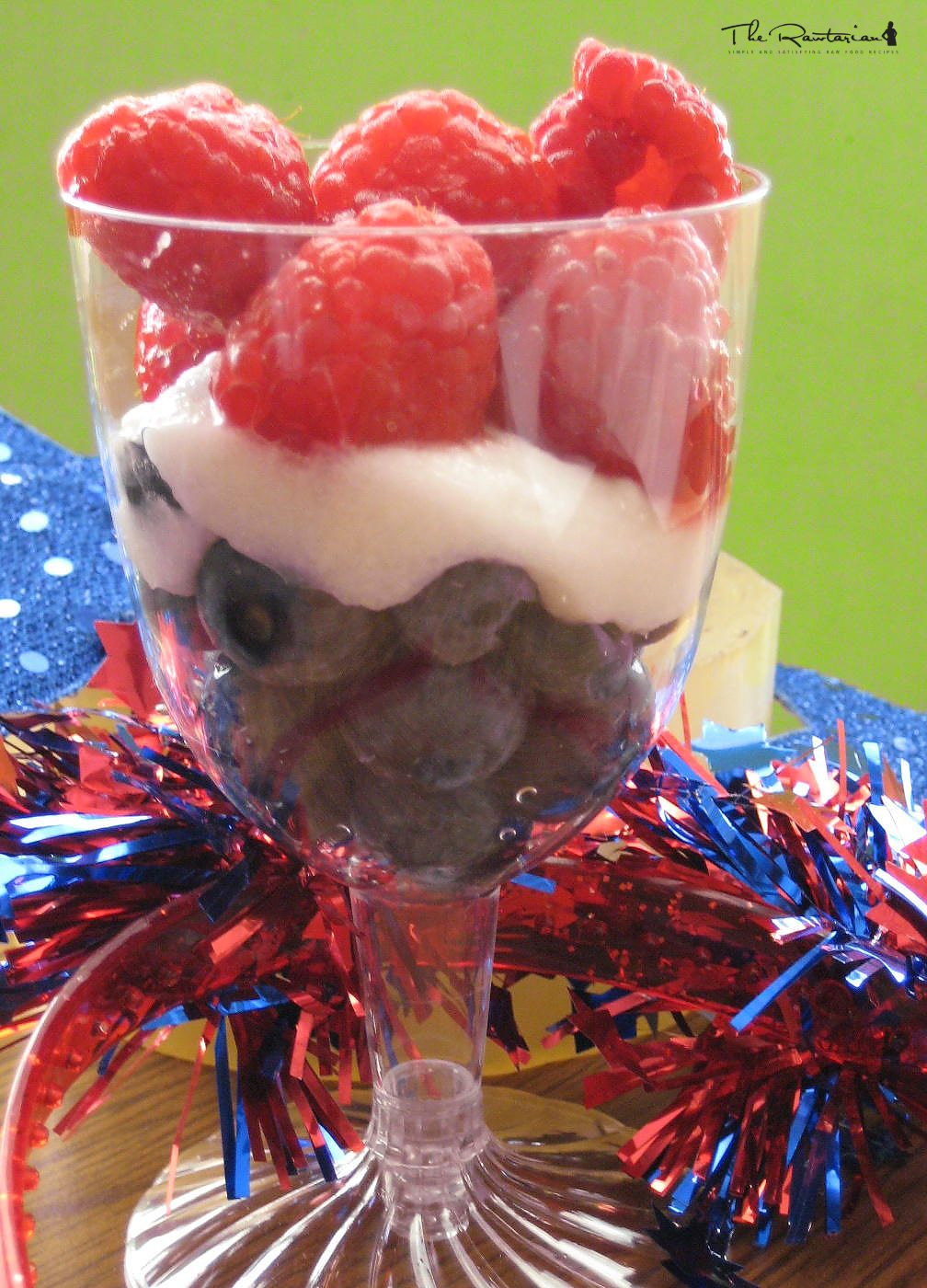 4. Place 1 tablespoon coconut cream on top of blueberries, and then place 5-6 raspberries on top of cream.