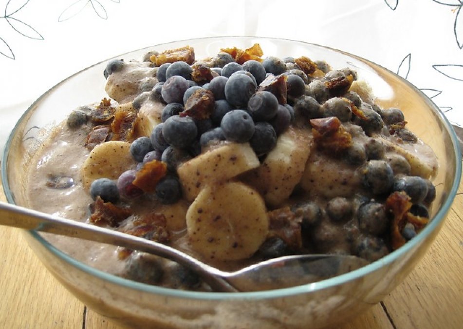 2. Blend 2 bananas (or more or less to your liking) with the dates and cacao, adding water to make a “banana milk” consistency.