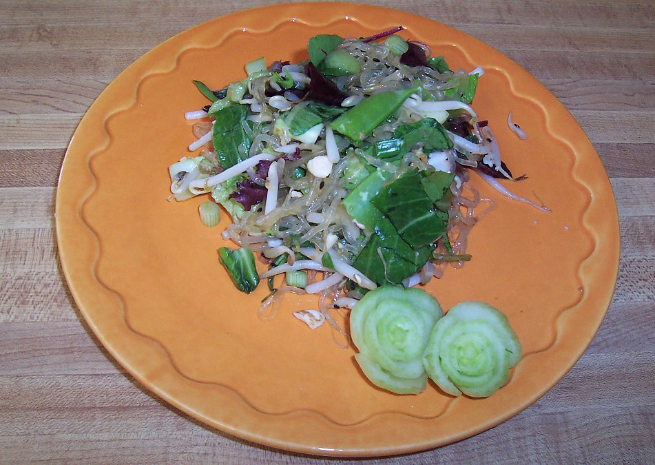 this salads nonraw form has the sesame seeds, crunched up ramen noodles, 1/2 cup sugar and butter sauteed until crisp….so for this version i desided to add cukes and the kelp noodle instead. I garnished with roughly crunched dehydrated tamari almonds, sprouts and a few left over snow peas…very yum