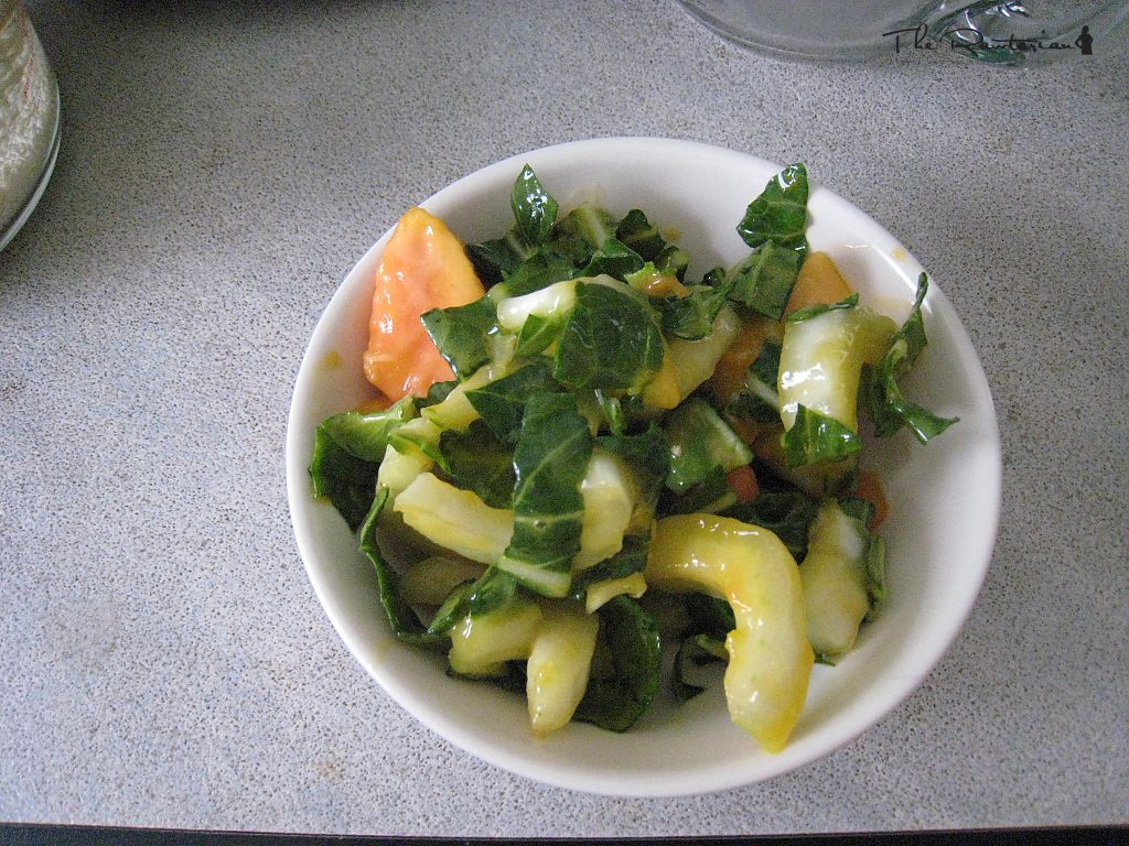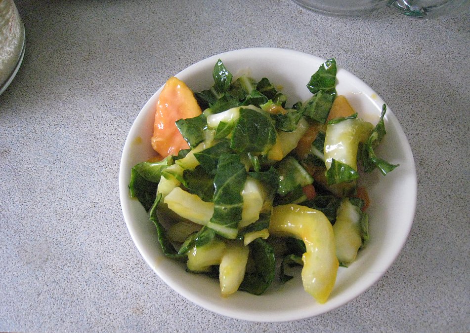 Toss the dressing with the sliced bok choy, papaya chunks, diced tomato and whatever diced mango is leftover from making the dressing.