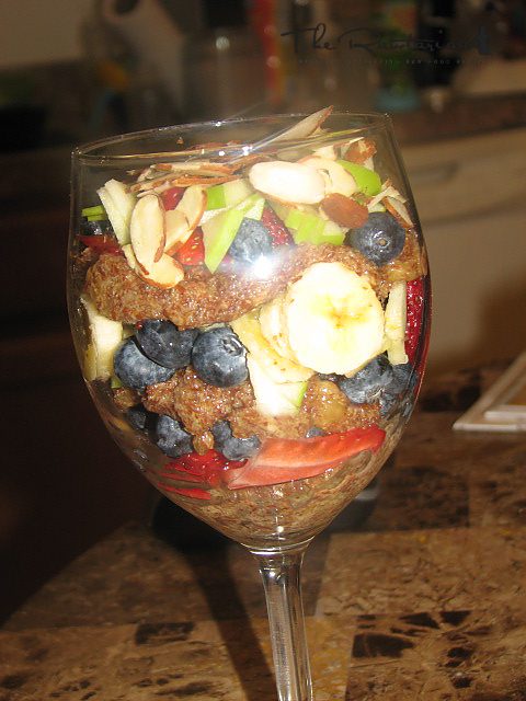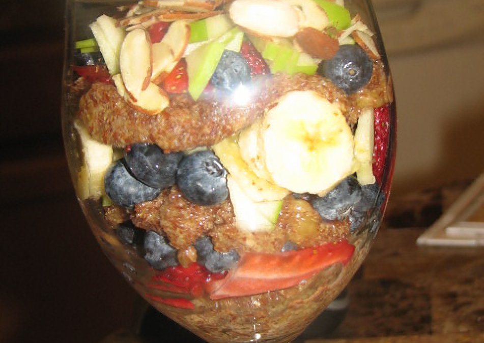 2. Layer banana and flax in between the fruit. Layer with almonds.