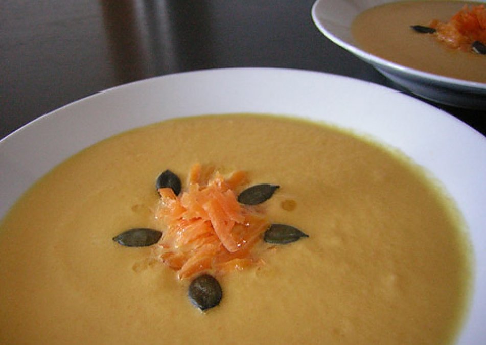 6. To serve, ladle soup into serving bowls. Garnish with reserved grated butternut squash and raw pumpkin seeds.