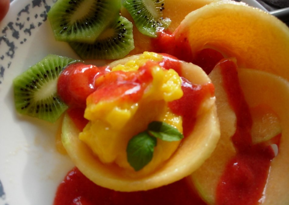 What great ideas, I bet that if you did strawberry sorbet instead, (same procedure as mango) then the chocolate sauce would be devine. The orange zest is a great idea as well. This is why I post these! Thanks so much!