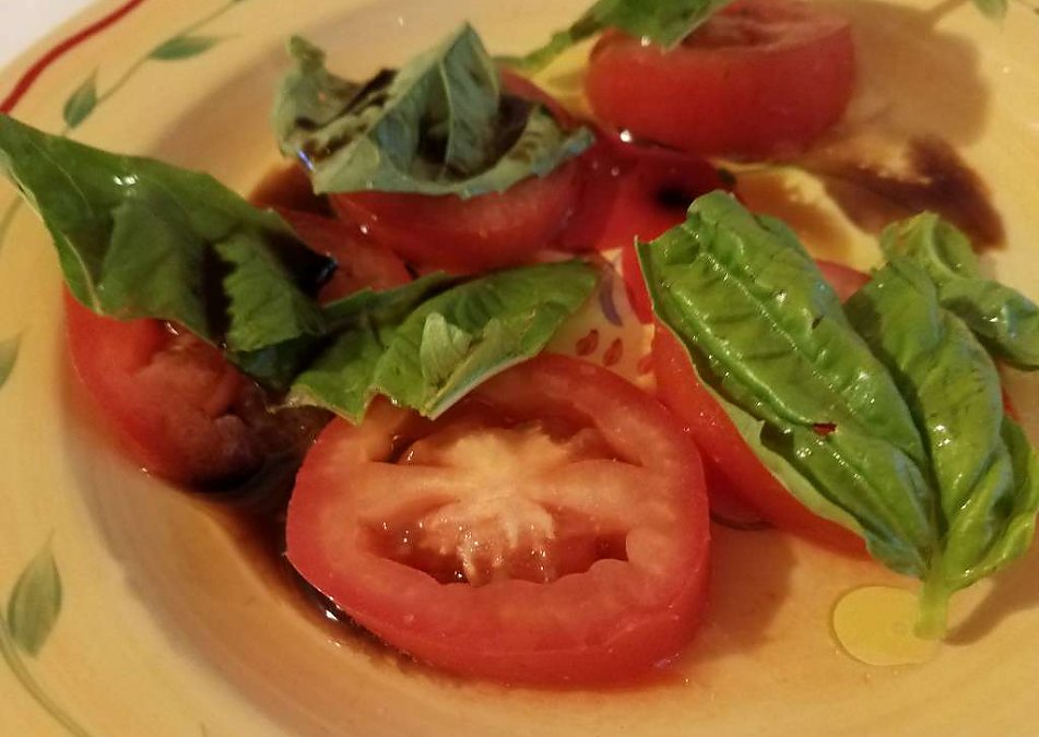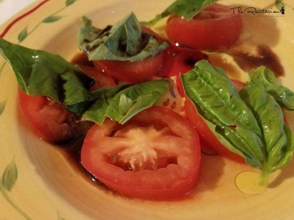 Drizzle olive oil and vinegar onto tomatoes and leaves, as well as all over the plate.