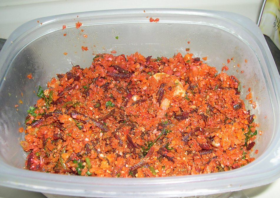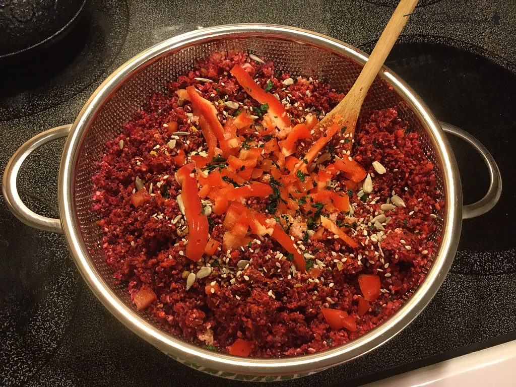 Pulse the cauliflower, beet and carrots in a food processor until rice-like. Mix vegetables in a bowl with the rest of the ingredients. Enjoy!
