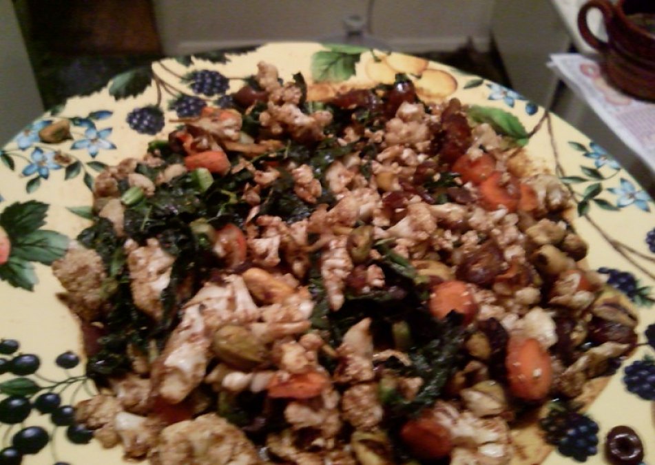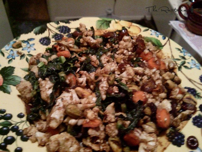 Chop vegetables as directed. Place in large bowl. In a seperate small bowl add sunflower oil, tamarind, nama shoyu, and all spices. Whisk together. Add to large blowl. Stir. Lastly add pistachios. Stir and Serve!