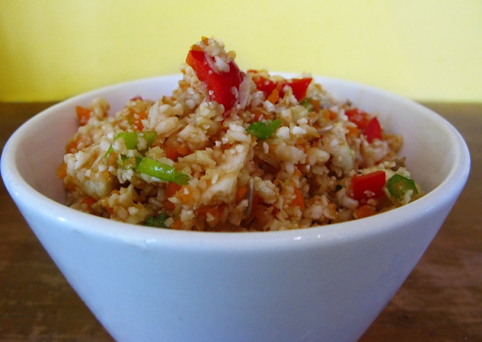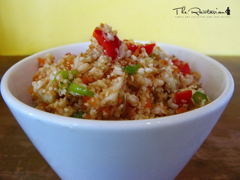 This cauliflower salad is reminiscent of stir fried rice. You basically just need a base of cauliflower and the sesame oil and tamari dressing as a base.