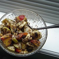 Coarsley chop celery and apple and place in bowl. Sprinkle raisins over top. Blend banana, water, and lime, then pour over top. Thats it!