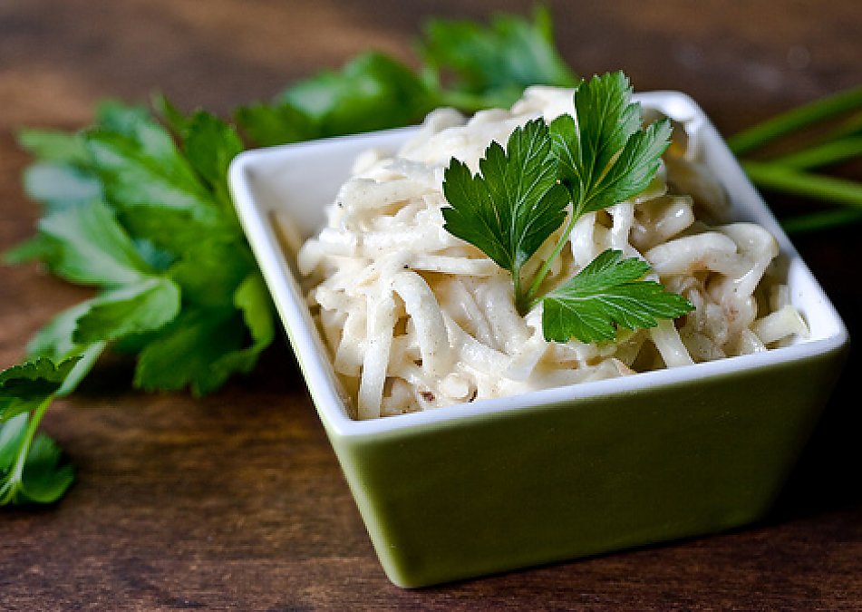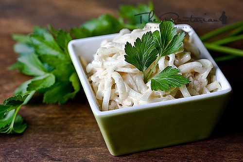 In another bowl, combine the dressing. Then toss shredded Celeriac with dressing. You may eat it immediately, but this refrigerates well. The longer it is refrigerated, up to a few days, the more tender the celeriac gets.