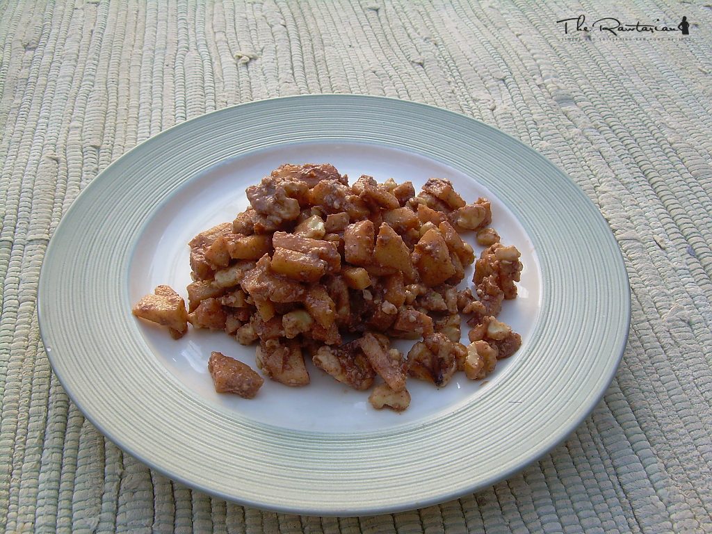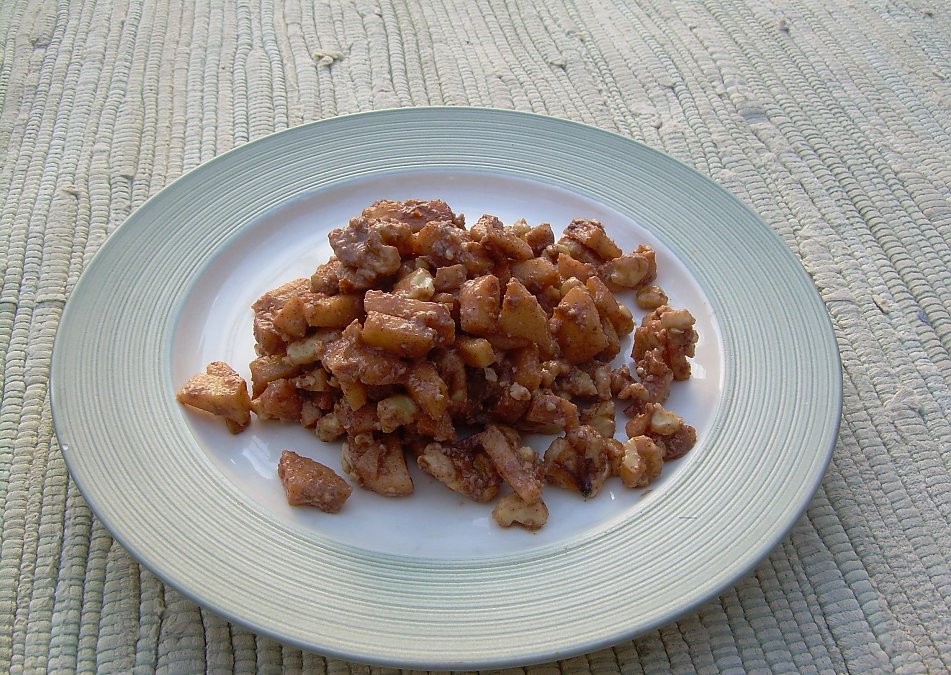 Well, it being Passover and all, I thought I’d add this delish side dish! It’s a good dessert after salad too. It symbolizes the mortar used by the Hebrews while enslaved in Egypt.