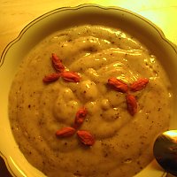 It's the beginning of cherimoya season here in Spain. Yay! This recipe is based on the Cream Dream from Jeremy A. Safron's The Raw Truth. In it, he calls for fresh apple juice in place of the water and the banana to be frozen in place of the ice. He's right though, it is very creamy and cream colored as well....