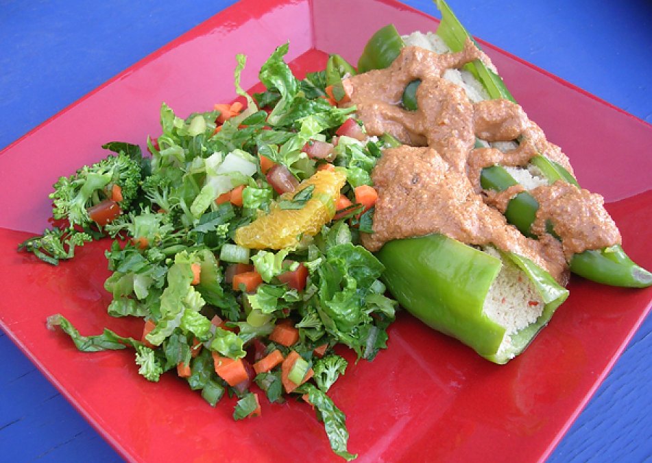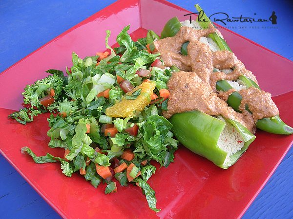 Place the strained cheese mixture into a food processor and add garlic, avocado, red bell pepper, salt and nutritional yeast and process until fluffy. Add water a little at a time until mixture holds the consistency of cream cheese and the nuts have been broken down as much as possible, Drain the anaheim chilis and pat dry lightly. Set on a plate and stuff each chili with enough cheese mixture to fill the cavity of each chili. There should be about 1/2-1 cup cheese mixture left over, and this can be left directly in the food processor for making the sauce. Refrigerate stuffed chilis while sauce and salad preparation is done.