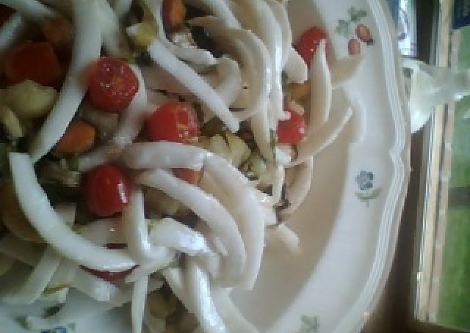 I left out the tomatoes and lettuce and added thinly sliced celery & green onions to my veggies and then added a little bit of fresh ginger and garlic to the marinade. I didn't stick my in the dehydrator and it was was refreshing on this hot summer day. Fall or winter, I'd probably warm it up.