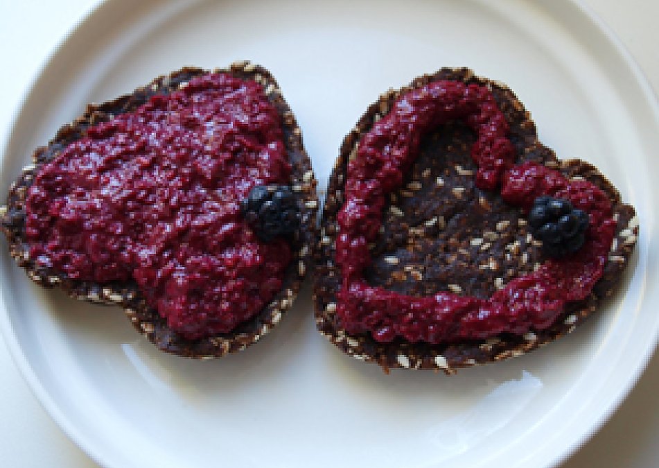Sweet chocolate hearts with sweet and sour blackberry chocolate sauce.