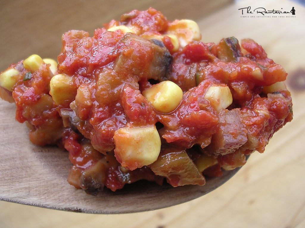 Eggplant and mushrooms in chili, who would have thought? But the combo is actually brilliant, and really different from other raw chilis that I’ve tried. The eggplant and mushrooms soften from marinating, and they absorb the flavor of the sauce. The result is a substantial texture and bursting flavor. The raw corn also adds a nice crunch and color contrast. I am a fan of all chili recipes, but this one is really standout for me.