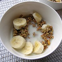 1. Measure all of the granola ingredients into big bowl while raisins and dates are soaking. Add/ substitute what ever dried fruits or nuts you would like (would be really good with something tart.) I chopped the almonds and brazils in a food processor, leaving a lot of big chunks.