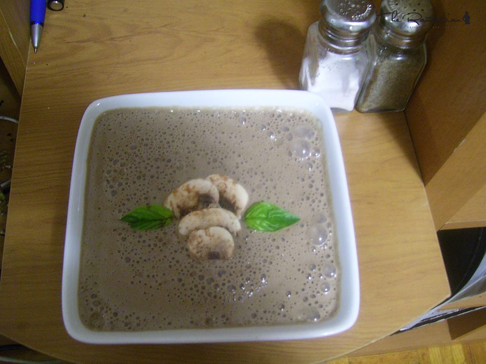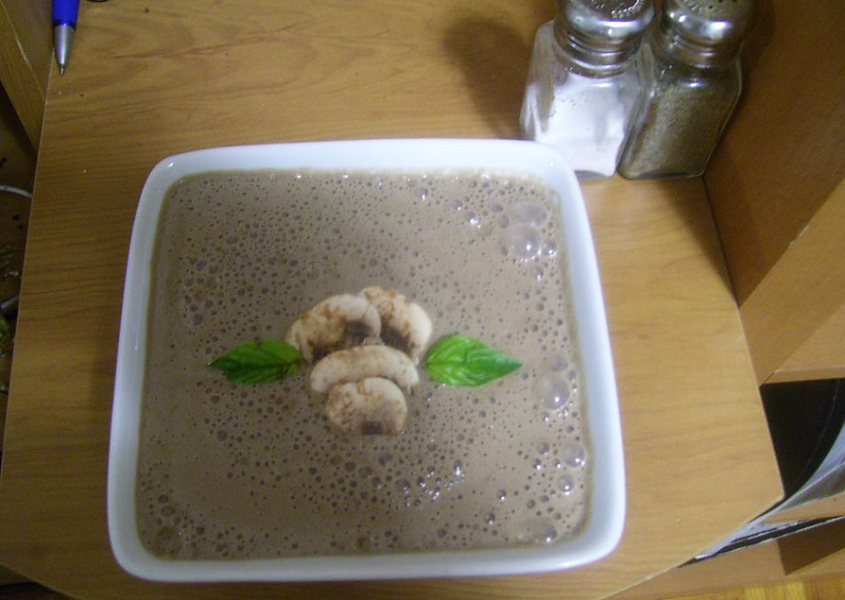 When I created this for the first time today, I made the mistake of blending the mushrooms for a while with the soup and the flavor was much more pungent and the color of the soup was grey, as you can see from the photo.