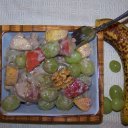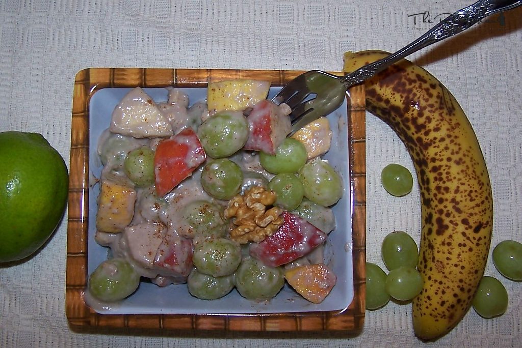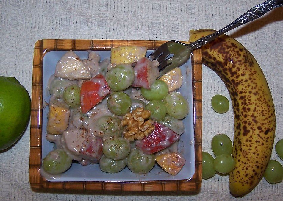 I forgot to add cardamom and cloves as the other two spices I used. It was actually a chai spice mix! The idea for this recipe was from the song about "put the lime in the coconut" which kind of gives it the mayo type of taste that I, for one, used to love in waldorf salads!