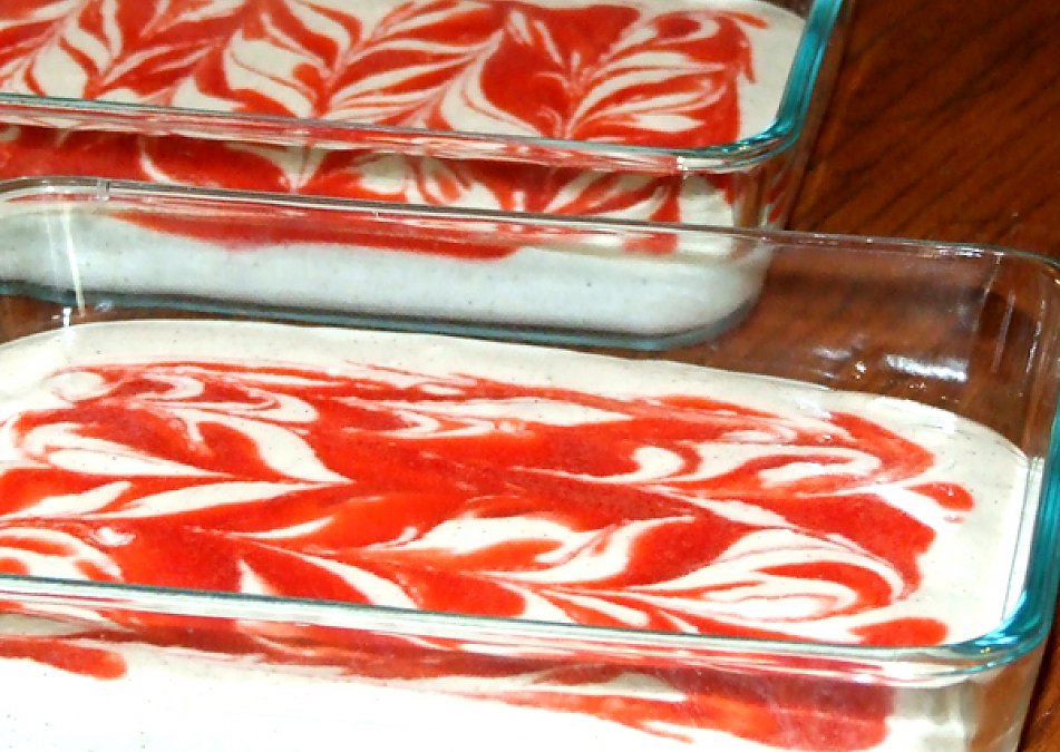 5. Using a spoon, drip strawberry sauce onto pudding and use the tip of a butter knife to swirl the sauce through the pudding.