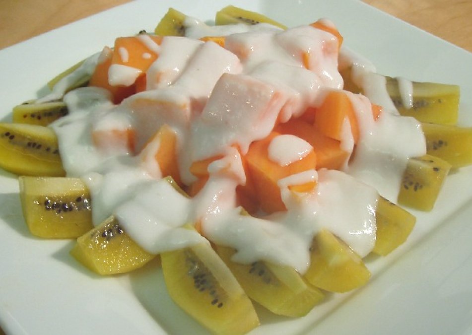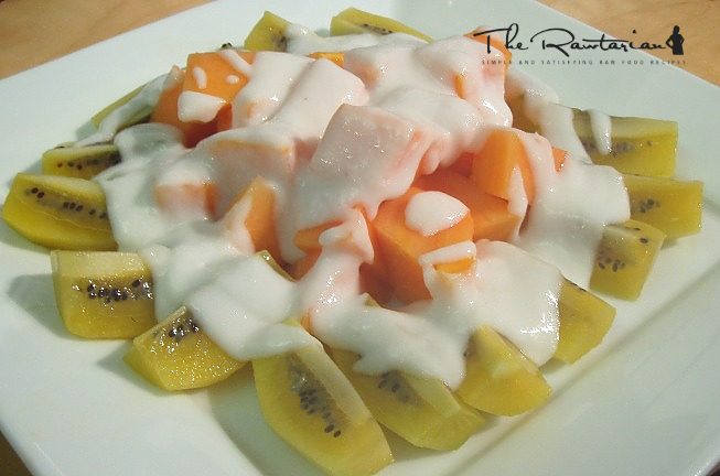 Blend all ingredients together until smooth. Set in the fridge for 15 minutes. Serve on top of sliced kiwi and papaya or any fruit. Good for breakfast.