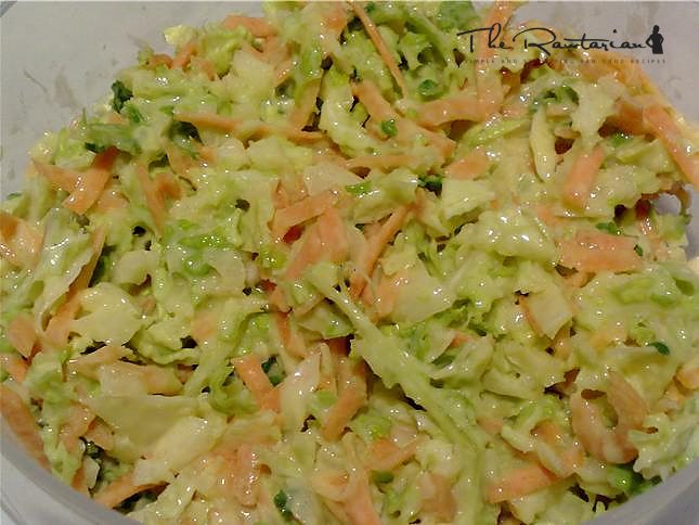1. Using half of the recipe for the Avocado Mayonnaise, mix it up with up to 100ml of water (depending on how runny or thick you want the liquid part of the coleslaw). Set aside.