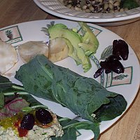 Put a dollop of pine nut filling in the collard green and Roll up like a sushi warapper. The filling will wrapper help to stay together. Eat along with the salad prepared above. Yum!