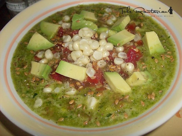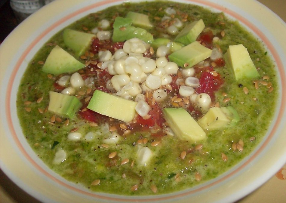 3. Top soup with corn kernels cut from the cob, diced avocado, and diced tomato.