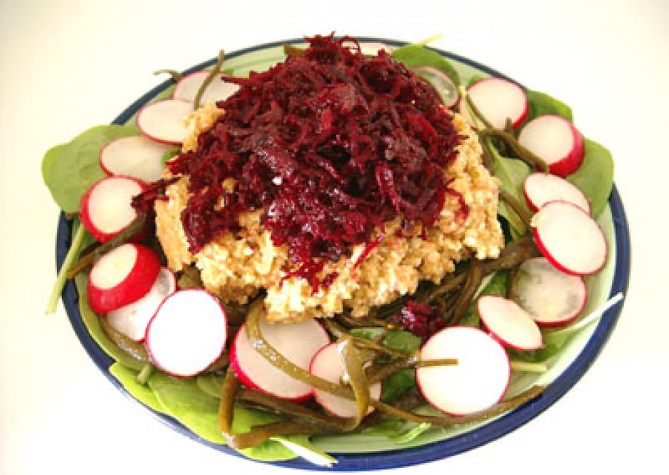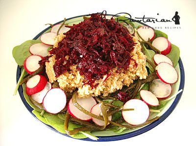 Place all the ingredients into the food processor and process until it looks like couscous. Warm it up in a pan if you like. To plate up, place fresh spinach and sea spaghetti on a plate. Add a tablespoon of salad dressing ( 2:1 olive oil/cider vinegar,pinch salt). Slice radishes and place round plate. Grate a small beet and place aside. Warm couscous (add a little salad dressing to the mixture if you like it more oily). Place on top of salad, add grated beet and drizzle with more salad dressing if you like. A few sesame seeds would look nice too.