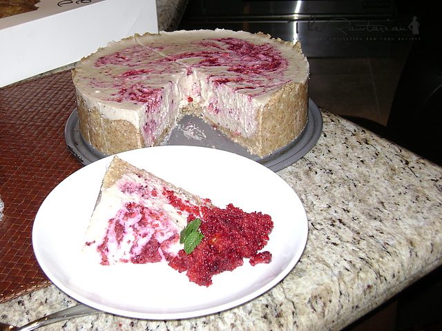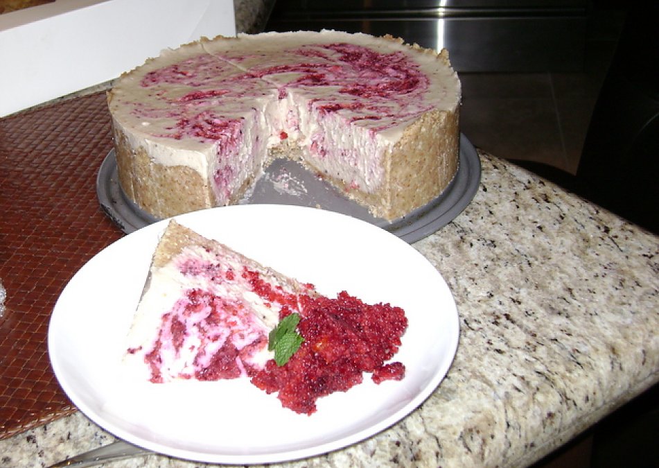 I was craving cheesecake and remembered this recipe was in my box. I had to mix pinenuts with the cashews because I didn't have enough. I substituted some dried sour cherries, blood oranges, apple and a few blueberries for the swirl. It looked so good we couldn't wait and cut into it after 6 hours in the fridge. It was unbelievably delicious! Thank you for such a wonderful recipe! It totally satisfied the craving and I felt great after eating it.