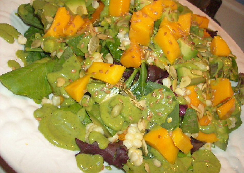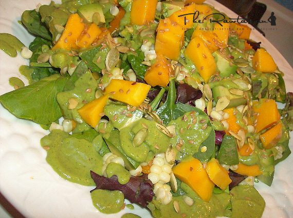 For the salad I used some mixed baby greens, raw corn [cut from the cob], mango, avocado & a sprinkle of flax seeds. :)