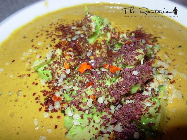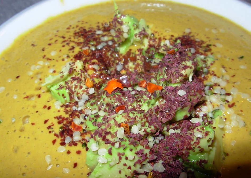Garnish: Chop up other half of the avocado, chopped black olives, sprinkle of dulse flakes, hemp seeds, chili flakes, a little tarragon leaf for presentation.